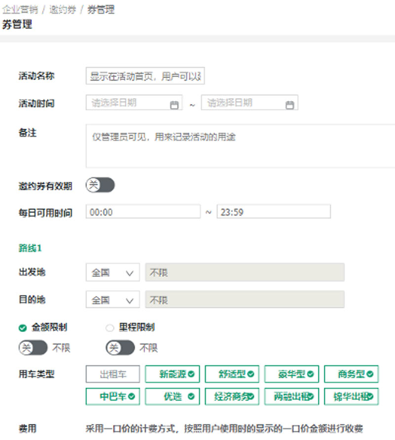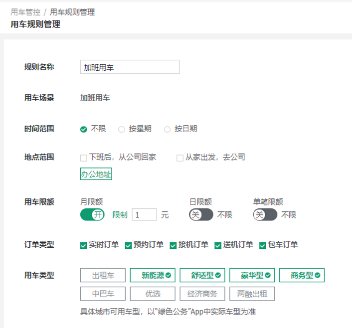 企业可自行管理设置用车规则,限定员工用车时间、地点、额度、车型等全部用车内容,同时规范企业用车情况,超出用车规则部分由员工自行承担费用,在用车前制定好科学的用车规则从源头降低违规的风险。