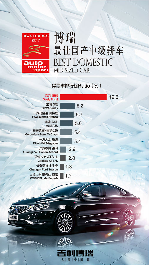 这是自主品牌中级车首次登上排名榜首,说明博瑞得到相当多中国消费者的信任。在投票榜上,博瑞以19.5%的票数遥遥领先。